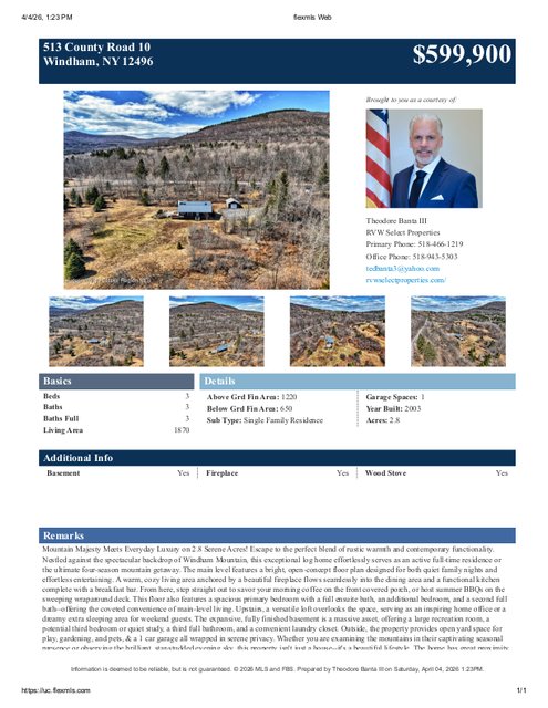 Mountain Majesty Meets Everyday Luxury on 2.8 Serene Acres! Escape to the perfect blend of rustic warmth and contemporary functionality. Nestled against the spectacular backdrop of Windham Mountain, this exceptional log home effortlessly serves as an active full-time residence or the ultimate four-season mountain getaway. The main level features a bright, open-concept floor plan designed for both quiet family nights and effortless entertaining. A warm, cozy living area anchored by a beautiful fireplace flows seamlessly into the dining area and a functional kitchen complete with a breakfast bar. From here, step straight out to savor your morning coffee on the front covered porch, or host summer BBQs on the sweeping wraparound deck. This floor also features a spacious primary bedroom with a full ensuite bath, an additional bedroom, and a second full bath--offering the coveted convenience of main-level living. Upstairs, a versatile loft overlooks the space, serving as an inspiring home office or a dreamy extra sleeping area for weekend guests. The expansive, fully finished basement is a massive asset, offering a large recreation room, a potential third bedroom or quiet study, a third full bathroom, and a convenient laundry closet. Outside, the property provides open yard space for play, gardening, and pets, & a 1 car garage all wrapped in serene privacy. Whether you are examining the mountains in their captivating seasonal presence or observing the brilliant, star-studded evening sky, this property isn't just a house--it's a beautiful lifestyle. The home has great proximity to the area's destinations and attractions as it's just minutes to Windham Ski Mountain, 10 minutes to Zoom Flume Water Park, 20 minutes to Hunter Ski Mountain, & 25 minutes to Colgate Lake. View our 3D virtual tours, floor plans, and multi-media website of the home and property.