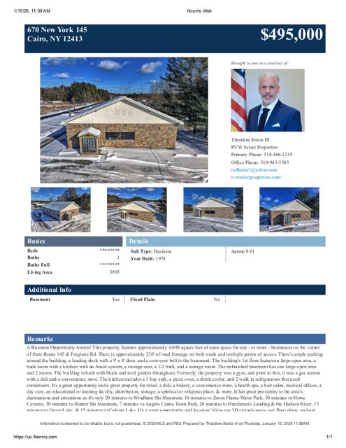 A Business Opportunity Awaits! This property features approximately 4,000 square feet of open space for one - or more - businesses on the corner of State Route 145 & Forgione Rd. There is approximately 320' of road frontage on both roads and multiple points of access. There's ample parking around the building, a loading dock with a 9' x 8' door, and a conveyor belt to the basement. The building's 1st floor features a large open area, a back room with a kitchen with an Ansul system, a storage area, a 1/2 bath, and a storage room. The unfinished basement has one large open area and 2 rooms. The building is built with block and steel girders throughout. Formerly, the property was a gym, and prior to that, it was a gas station with a deli and a convenience store. The kitchen includes a 3 bay sink, a pizza oven, a drink cooler, and 2 walk in refrigerators that need condensers. It's a great opportunity and a great property for retail, a deli, a bakery, a convenience store, a health spa, a hair salon, medical offices, a day care, an educational or training facility, distribution, storage, a spiritual or religious place, & more. It has great proximity to the area's destinations and attractions as it's only 20 minutes to Windham Ski Mountain, 10 minutes to Zoom Flume Water Park, 50 minutes to Howe Caverns, 30 minutes to Hunter Ski Mountain, 7 minutes to Angelo Canna Town Park, 20 minutes to Dutchman's Landing & the Hudson River, 15 minutes to Green Lake, & 15 minutes to Colgate Lake. It's a great opportunity and location! View our 3D virtuals tours, our floor plans, and our multi-media website.