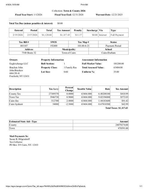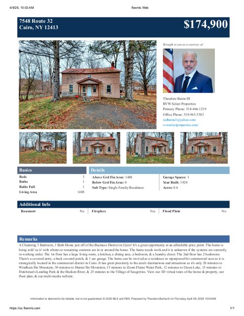 A Charming 3 Bedroom, 1 Bath Home just off of the Business District in Cairo! It's a great opportunity at an affordable price point. The home is being sold 'as is' with whatever remaining contents are in or around the home. The home needs work and it is unknown if the systems are currently in working order. The 1st floor has a large living room, a kitchen, a dining area, a bedroom, & a laundry closet. The 2nd floor has 2 bedrooms. There's a covered entry, a back covered porch, & 1 car garage. The home can be revived as a residence or repurposed for commercial uses as it is strategically located in the commercial district in Cairo. It has great proximity to the area's destinations and attractions as it's only 20 minutes to Windham Ski Mountain, 30 minutes to Hunter Ski Mountain, 15 minutes to Zoom Flume Water Park, 12 minutes to Green Lake, 15 minutes to Dutchman's Landing Park & the Hudson River, & 25 minutes to the Village of Saugerties. View our 3D virtual tours of the home & property, our floor plan, & our multi-media website.