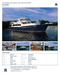 Introducing "Good Answer," a magnificent 78-foot Marlow Explorer 78E that exemplifies the perfect blend of luxury, performance, and thoughtful design. This custom-built motor yacht showcases the renowned Marlow composite structure hull with numerous special options throughout.
